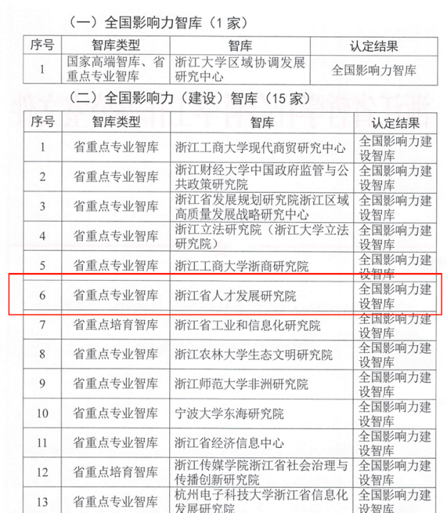 近日,浙江省哲学社会科学工作办公室发布《关于公布2024年度全国影响力建设(培育)智库遴选结果的通知》(浙社科办〔2025〕48号),浙江省人才发展研究院入选2024年度全国影响力(建设)智库。本次遴选认定工作共评出全国影响力智库1家,全国影响力(建设)智库15家,全国影响力(培育)智库14家。详情见: https://www.zjskw.gov.cn/art/2025/9/16/art_1229516287_65163.html