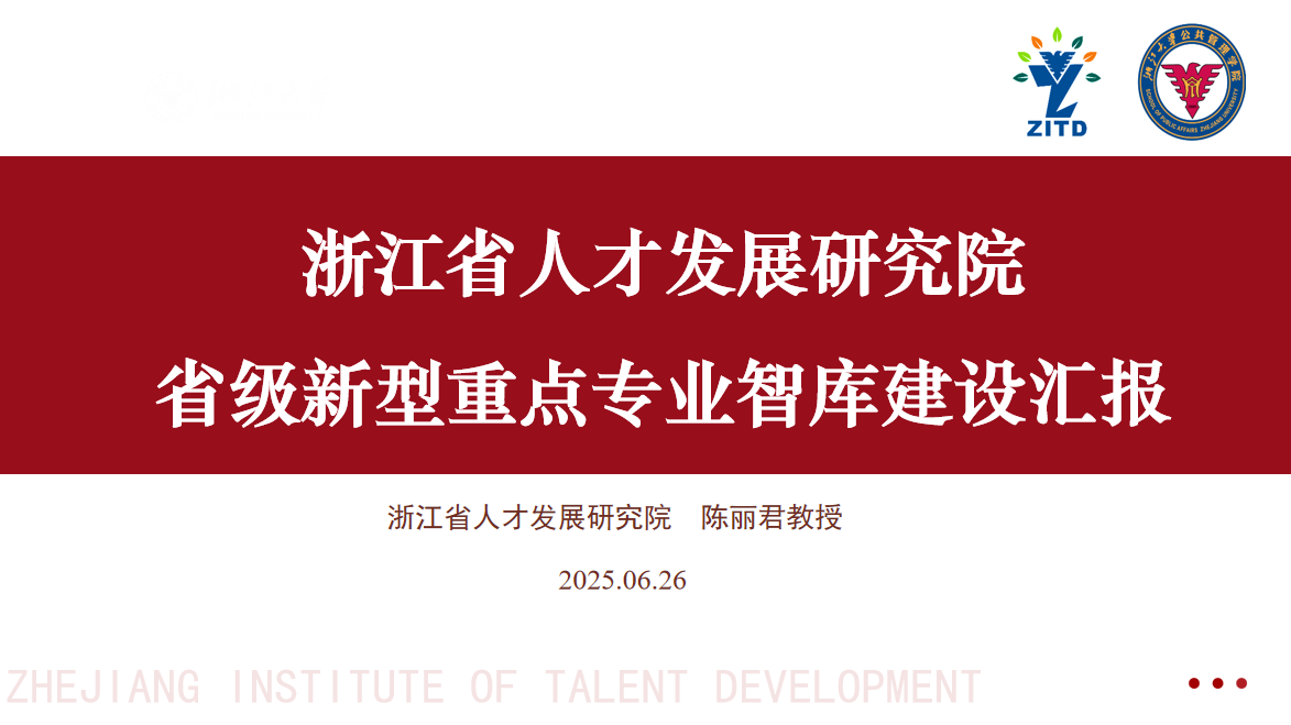 6月26日,2025年度省社科联业务主管社会组织业务工作培训在杭州举办,浙江省人才发展研究院院长、浙江大学公共管理学院教授陈丽君参会并作典型交流发言,从人才理论研究、智库品牌打造、系列论坛举办、媒体发声与社会服务、队伍建设与合作交流五个方面汇报了浙江省人才发展研究院省级新型重点专业智库建设的经验做法。